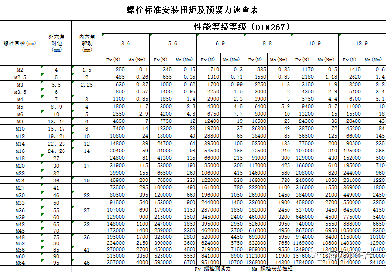附螺栓標(biāo)準(zhǔn)安裝扭矩及預(yù)緊力速查表