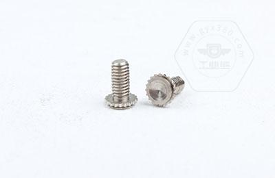 在使用過(guò)程中需在基體上開(kāi)一個(gè)小孔,將壓鉚螺釘放入孔內(nèi),采用鉚壓設(shè)備平行的均勻的在頭部平壓,因壓鉚螺釘?shù)念^部下有齒紋壓花,當(dāng)壓入后,基體在壓鉚螺釘?shù)闹車(chē)a(chǎn)生變形,和齒紋發(fā)生咬合現(xiàn)象,從而形成一個(gè)牢固的外螺紋。